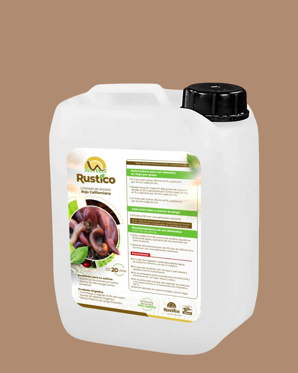 RUSTICO® es un fertilizante líquido natural elaborado a partir de lixiviado de lombriz. Aporta nutrientes esenciales, mejora la fertilidad del suelo y estimula el crecimiento saludable de las plantas.
